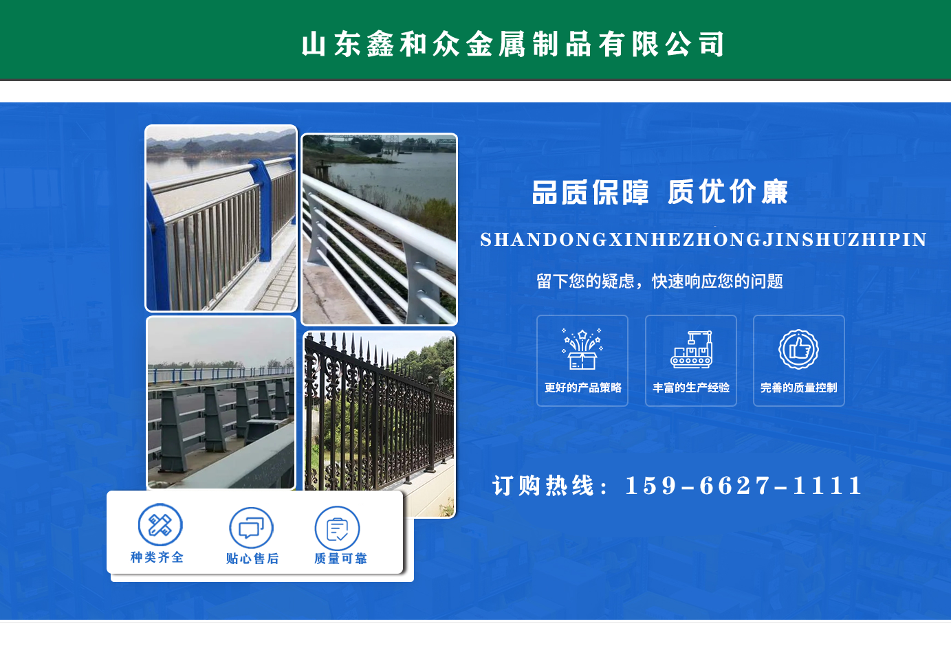山東鑫和眾金屬制品有限公司主要產(chǎn)品有防撞護(hù)欄,橋梁護(hù)欄,道路護(hù)欄,河道護(hù)欄,不銹鋼護(hù)欄等護(hù)欄。提供設(shè)計(jì)方案,一站式定制,包您滿(mǎn)意價(jià)格優(yōu)惠,歡迎來(lái)電咨詢(xún)!    公司常年從事銷(xiāo)售護(hù)欄防撞護(hù)欄,橋梁護(hù)欄,道路護(hù)欄,河道護(hù)欄,不銹鋼護(hù)欄,橋梁鋼護(hù)欄,河道燈光護(hù)欄等。產(chǎn)品廣泛應(yīng)用于橋梁、河道、旅游景區(qū)、道路、公路、公園、小區(qū)、景觀(guān)、道路防撞等領(lǐng)域。    公司產(chǎn)品均采用優(yōu)質(zhì)不銹鋼材料,符合相關(guān)標(biāo)準(zhǔn)。各種型號(hào)不銹鋼復(fù)合管及護(hù)欄,質(zhì)量嚴(yán)格把控。產(chǎn)品強(qiáng)度高、耐腐蝕、焊接牢固、抗沖擊、性能好,防撞護(hù)欄結(jié)構(gòu)簡(jiǎn)單、美觀(guān)實(shí)用大方。     歡迎前來(lái)訂購(gòu)!...